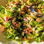 This crunchy chop salad combines 5 ingredients - celery, iceberg lettuce, radishes, and apples with salty roasted nuts for extra flavor and texture. Fresh and delicious, the combination. is the perfect side to brighten Spring meals.