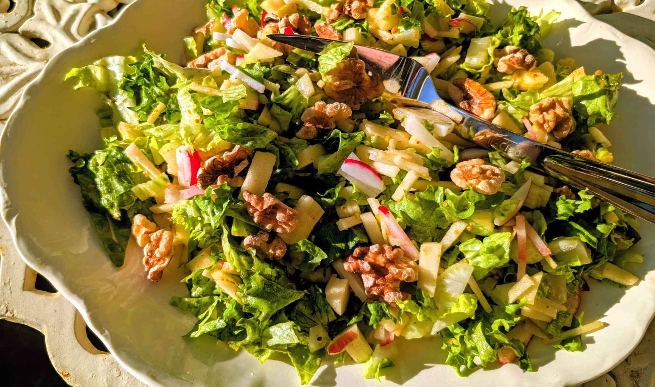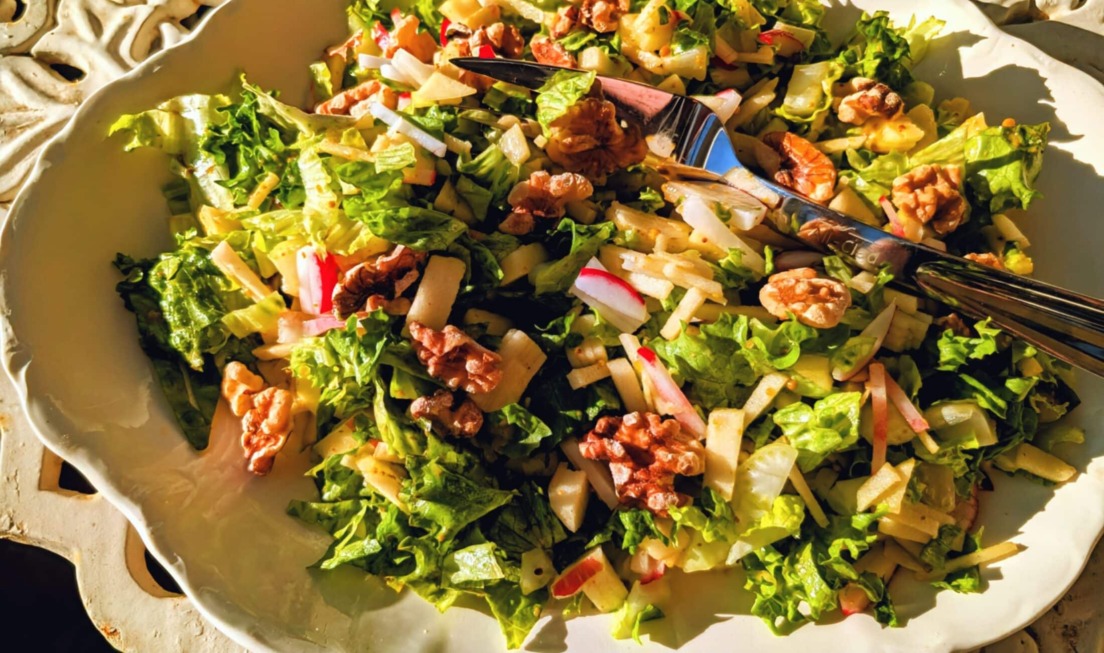 An option: gather the slices or hunks of celery, apple, radishes and celery and place them on a spacious cutting board then chop through them with a chef's knife until they are approximately 1/2 inch or slightly smaller, then return the the salad bowl and pour over the dressing, toss, and add the toasted, salty nuts.