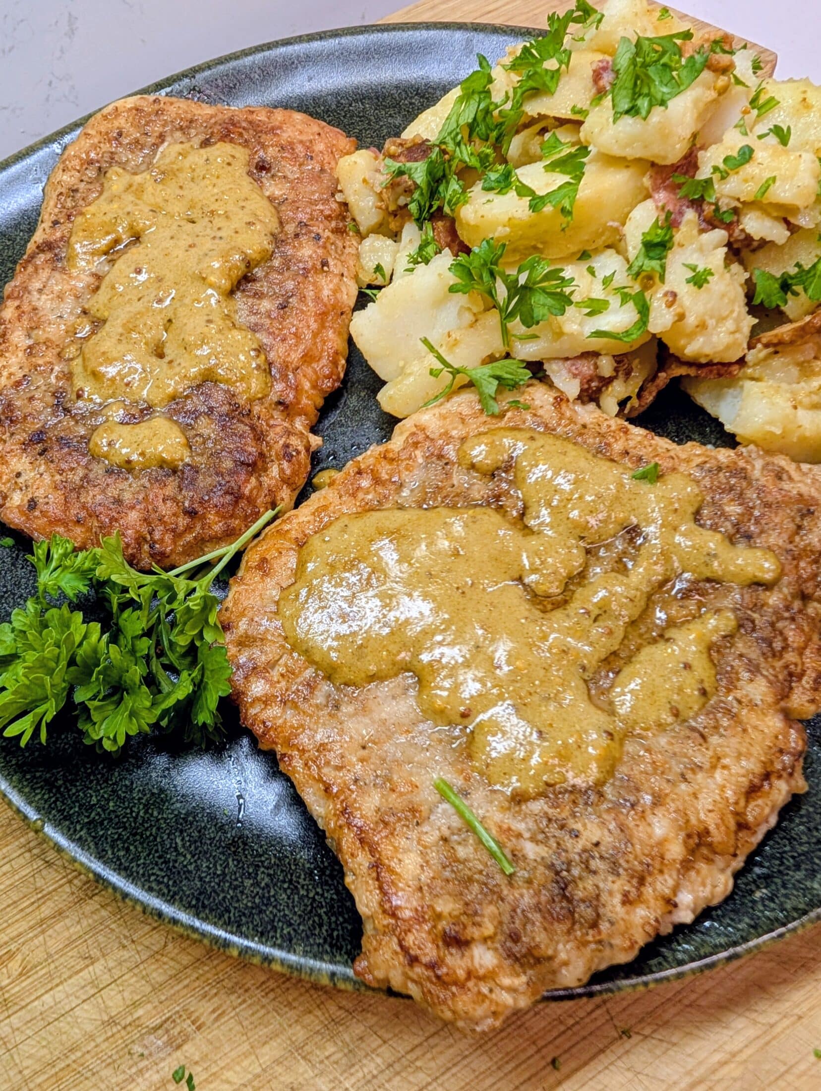 I most often serve the cutlet with roasted potatoes although broccoli or cauliflower roasted on a sheet pan show off nicely on the plate and add their unique flavors.